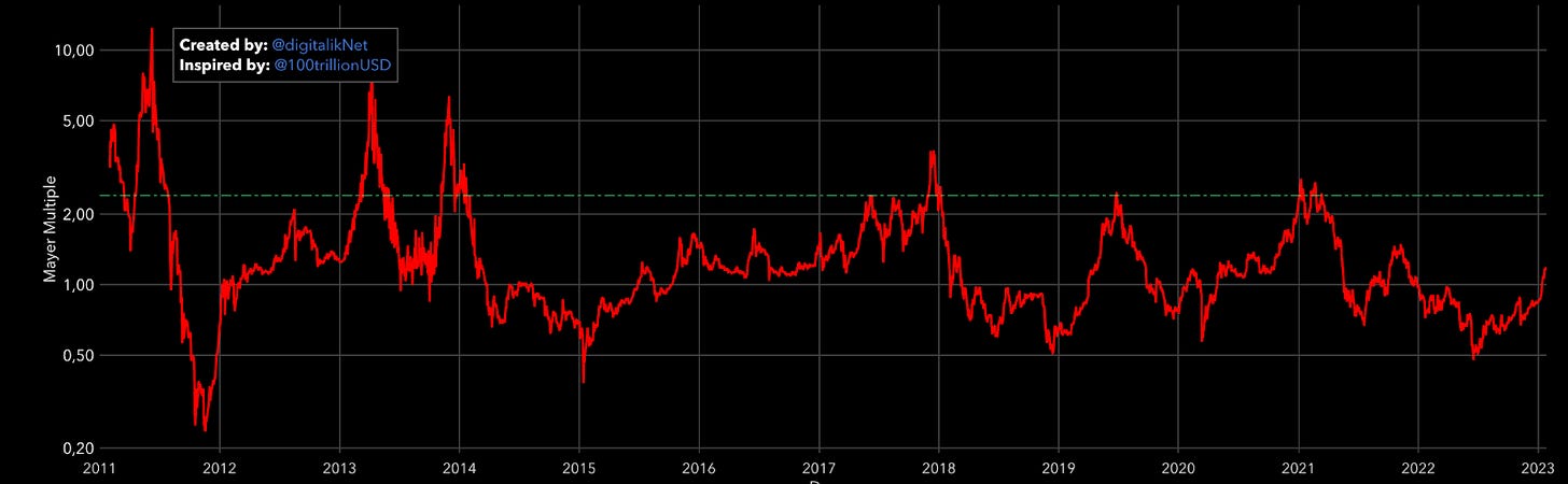 O Múltiplo de Meyer, que representa o preço do BTC atual dividido pela sua média móvel dos últimos 200 dias, passou essa semana por uma "reversão". Graficamente isso é representado pelo múltiplo cruzando o valor de 1,0. Quando o múltiplo está abaixo de 1,0, o preço atual está abaixo da média móvel de 200 dias, e quando o múltiplo está acima, o preço atual está acima da média móvel de 200 dias. O gráfico a seguir indica que os preços em média voltaram a estar a cima da média móvel de 200 dias. Atualmente o múltiplo se encontra em 1,18, indicando um aumento 18% em relação a ela. Esse múltiplo é superior ao de 45% dos dias desde a criação do bitcoin. Durante 2022 ele chegou a bater 0,48, o menor valor desde 2015.