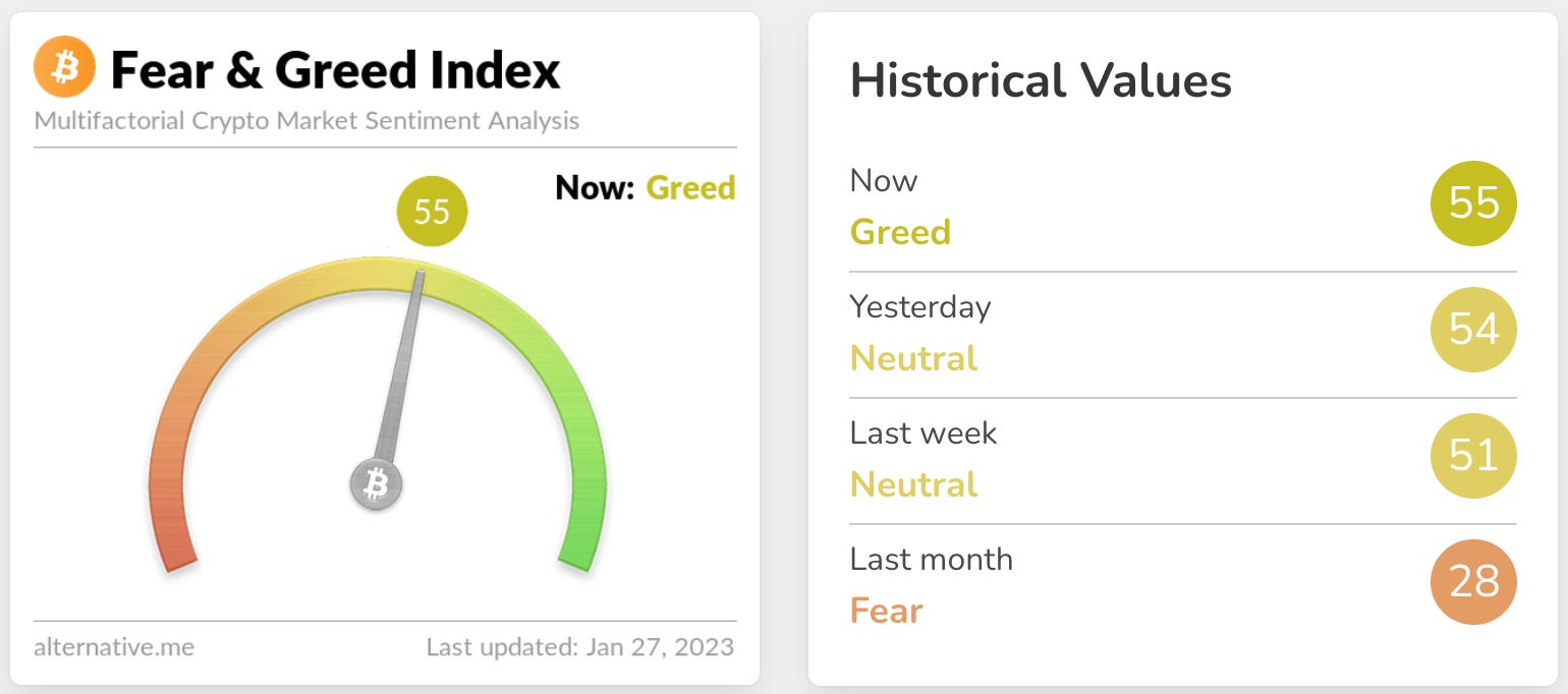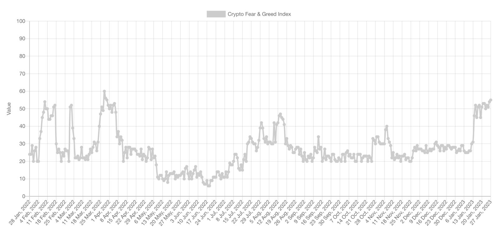 O indicador Fear & Greed index, que mensura o sentimento de mercado em relação ao momento atual, está em 55 pontos, apresentando, depois de muito tempo, o sentimento de “ganância”, que pode ser interpretado como uma percepção mais otimista do mercado. O indicador vinha se estabilizando entre os 20 e 30 pontos desde a sinalização de recuperação do mercado após o colapso da FTX, mas recentemente houve uma melhora da percepção dos investidores. Esse é o valor mais positivo do indicador desde o colapso do ecossistema Terra LUNA em maio de 2022.