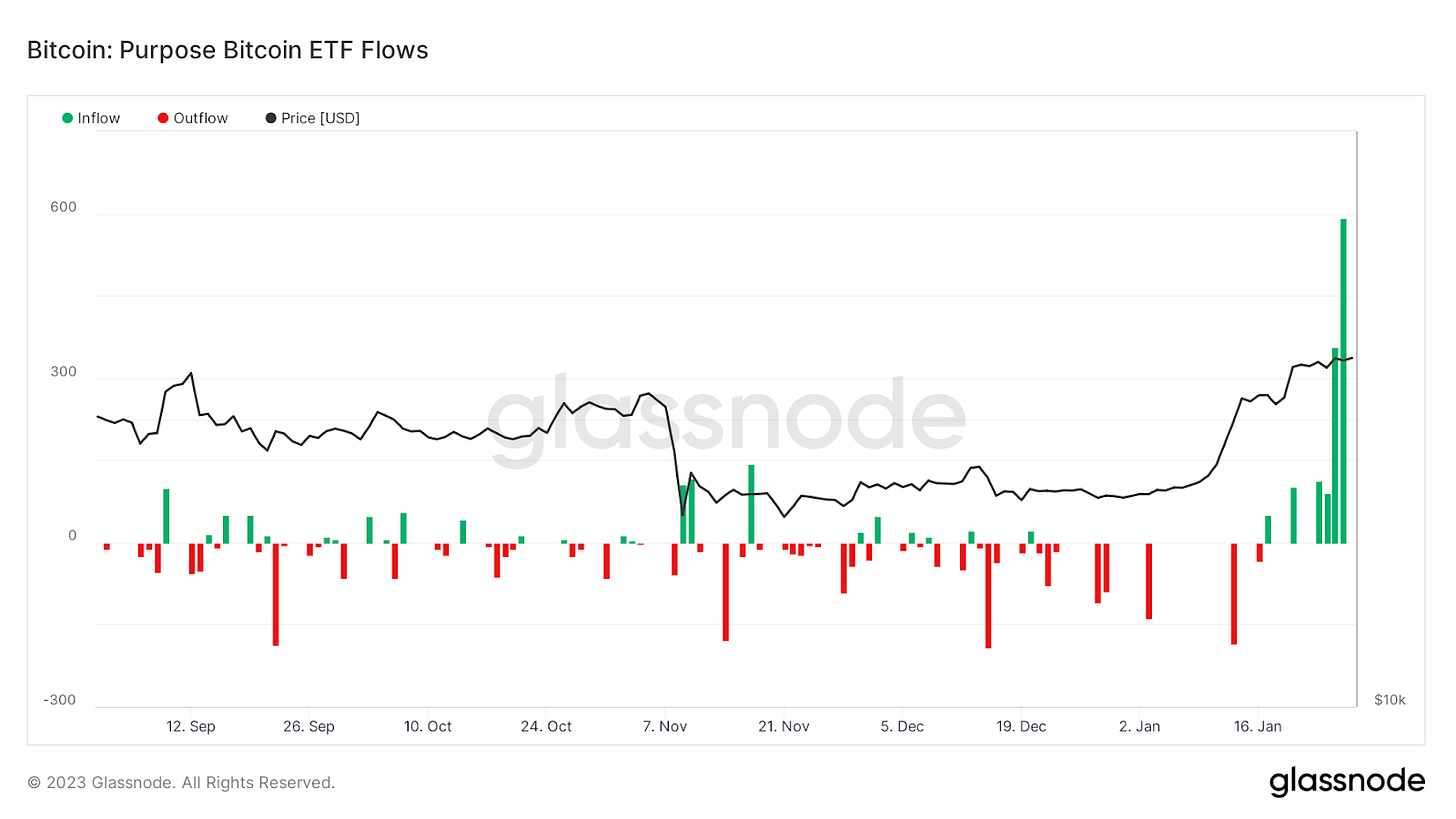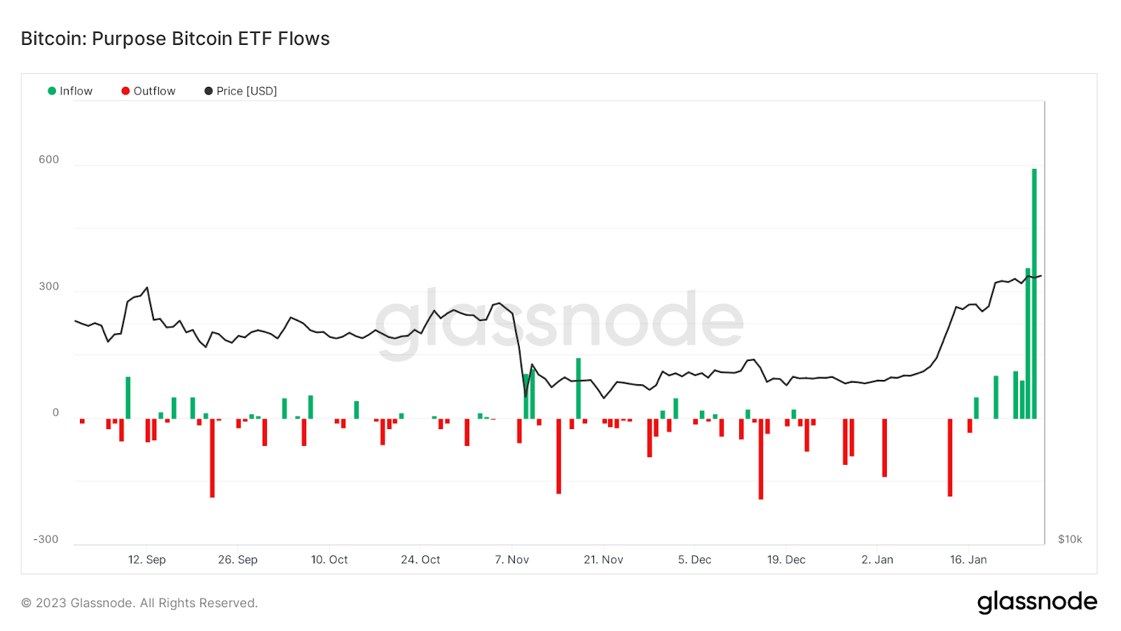 Já em relação à retomada de interesse dos investidores institucionais pelo bitcoin, temos as métricas do gráfico a seguir como referência. Essa percepção da retomada pôde ser extraída da quantidade de investidores comprando o ETF da Purpose, uma das principais formas reguladas de exposição ao ativo. O crescimento do fluxo líquido de compras de bitcoins disparou nos últimos dias.
