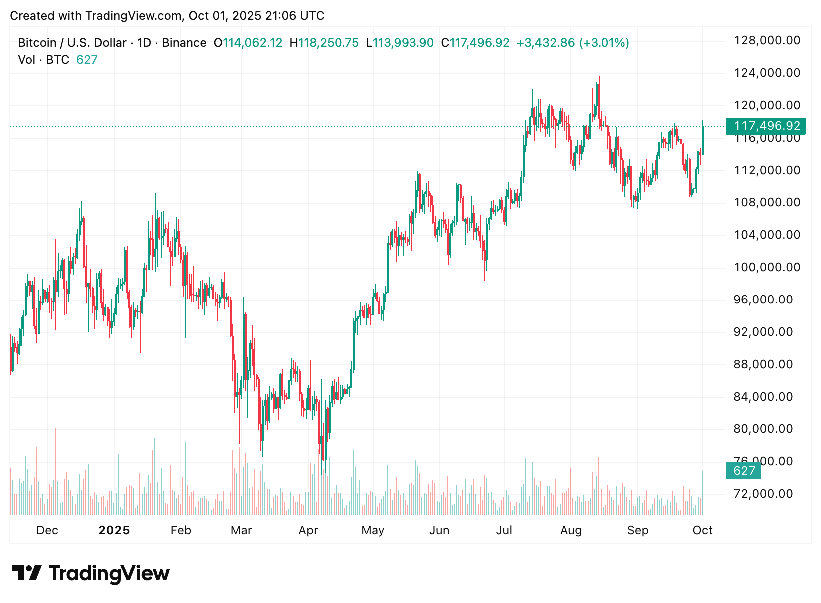 A empresa japonesa Metaplanet, quarta maior detentora corporativa de Bitcoin no mundo, comprou mais 5,26 mil BTCs por US$ 616 milhões. O movimento ocorre quando o Bitcoin inicia o mês de outubro próximo aos US$ 117 mil, historicamente o melhor mês para a criptomoeda, que alcança retornos médios de 20,4%. (CryptoSlate)