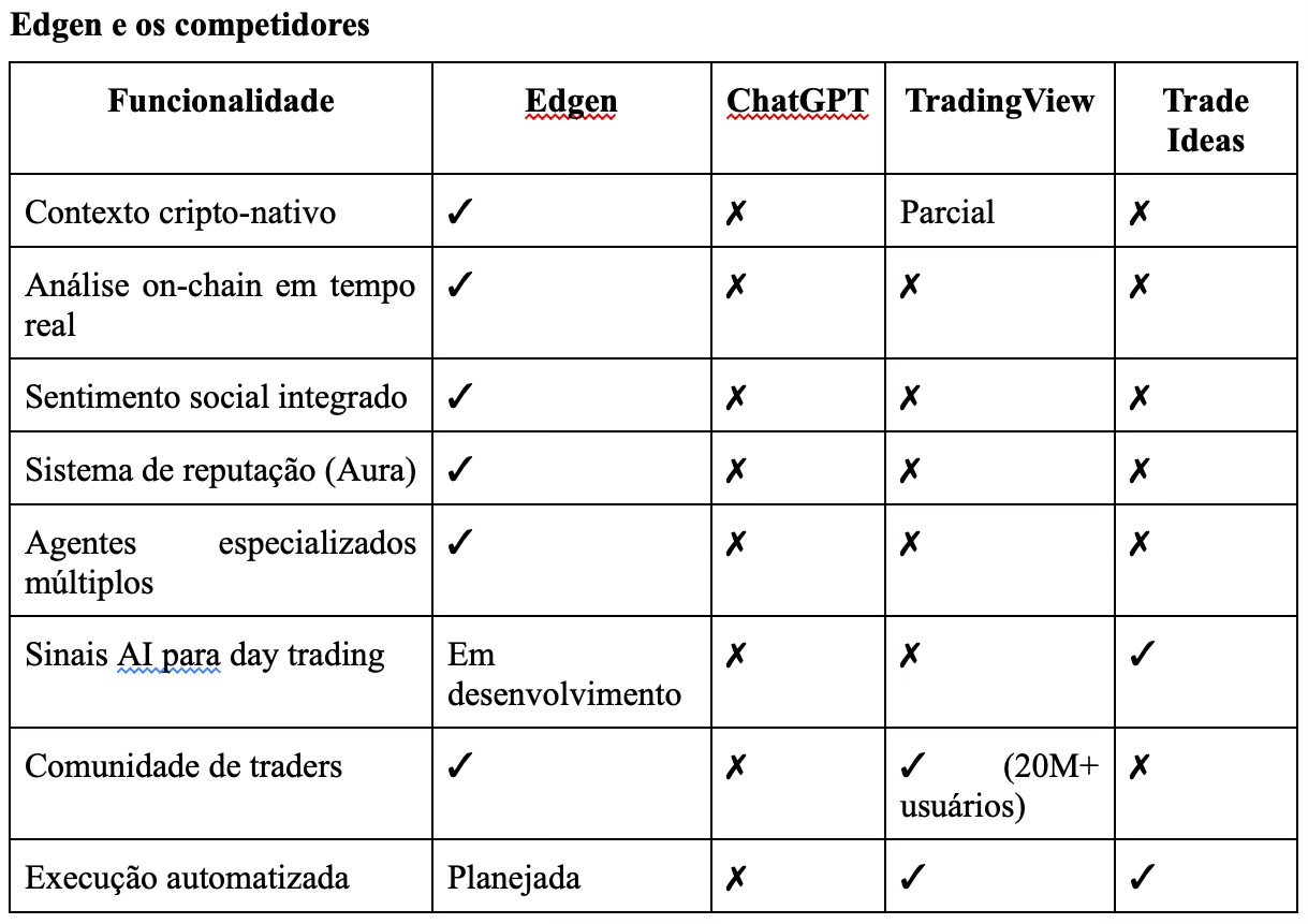 Mas o Edgen tem vantagens estruturais significativas. Primeiro, timing perfeito: lançou exatamente quando o mercado cripto entrou em bull run, com o Bitcoin atingindo US$ 108 mil e a capitalização total de cripto chegando a US$ 3,7 trilhões. Segundo, foco laser em cripto enquanto os competidores tentam cobrir todos os mercados. Terceiro, efeitos de rede poderosos: quanto mais traders usam e contribuem, mais inteligente o sistema fica.