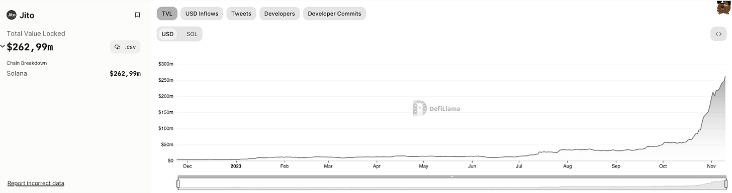 Isso pode ser considerado como um ponto de questionamento em relação a sustentabilidade desse crescimento, mas como o setor de staking líquido gera mais eficiência de capital, está se desenvolvendo bem em outros ecossistemas e percentualmente ainda tem muita margem para se desenvolver na Solana, pode ser que esses programas estejam apenas acelerado um processo que naturalmente viria a acontecer. A Jito é um case impressionante, tendo saído praticamente do zero e em poucos meses já passou a representar 22% do TVL de toda a rede.