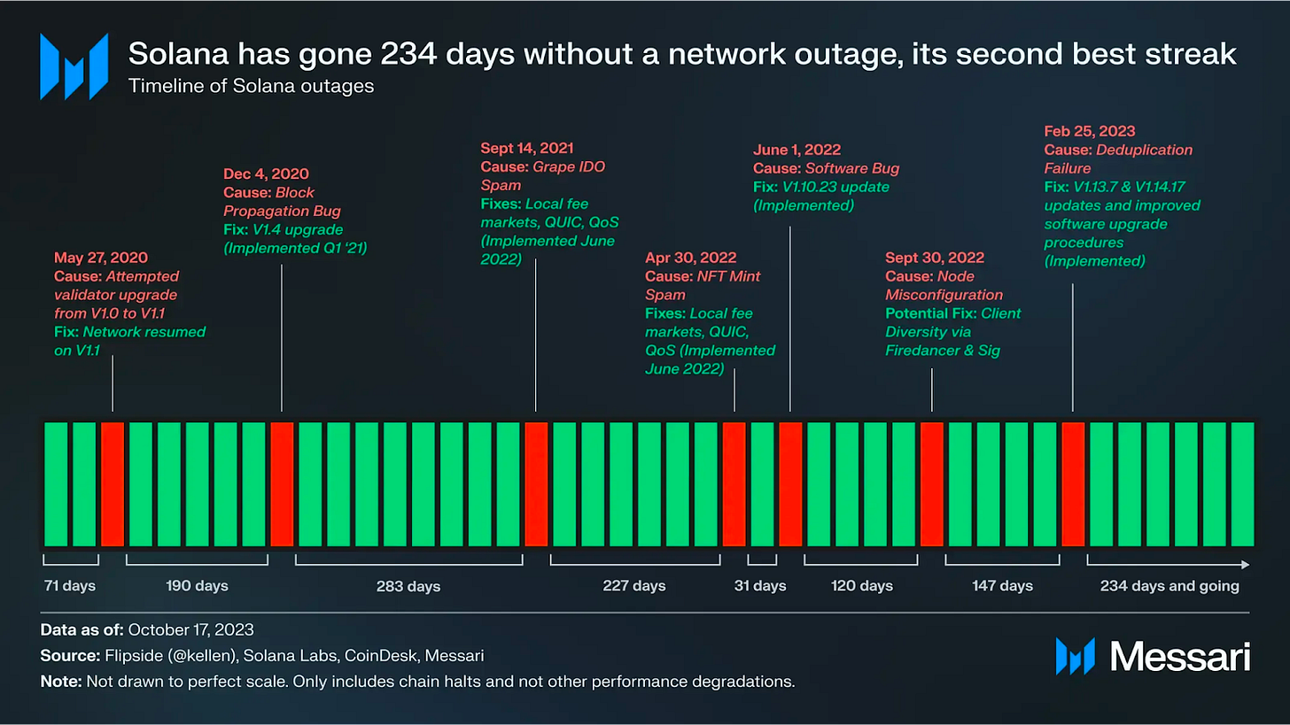 Apesar do colapso da FTX ter sido o fundo do poço para o ativo, o mesmo já vinha sofrendo com problemas em sua infraestrutura durante todo o ano de 2022. Sua proposta ambiciosa de resolver o problema de escalabilidade entregando um produto de alta performance acabou resultando em graves e recorrentes travamentos da rede desde seu lançamento, como podemos observar no gráfico a seguir.