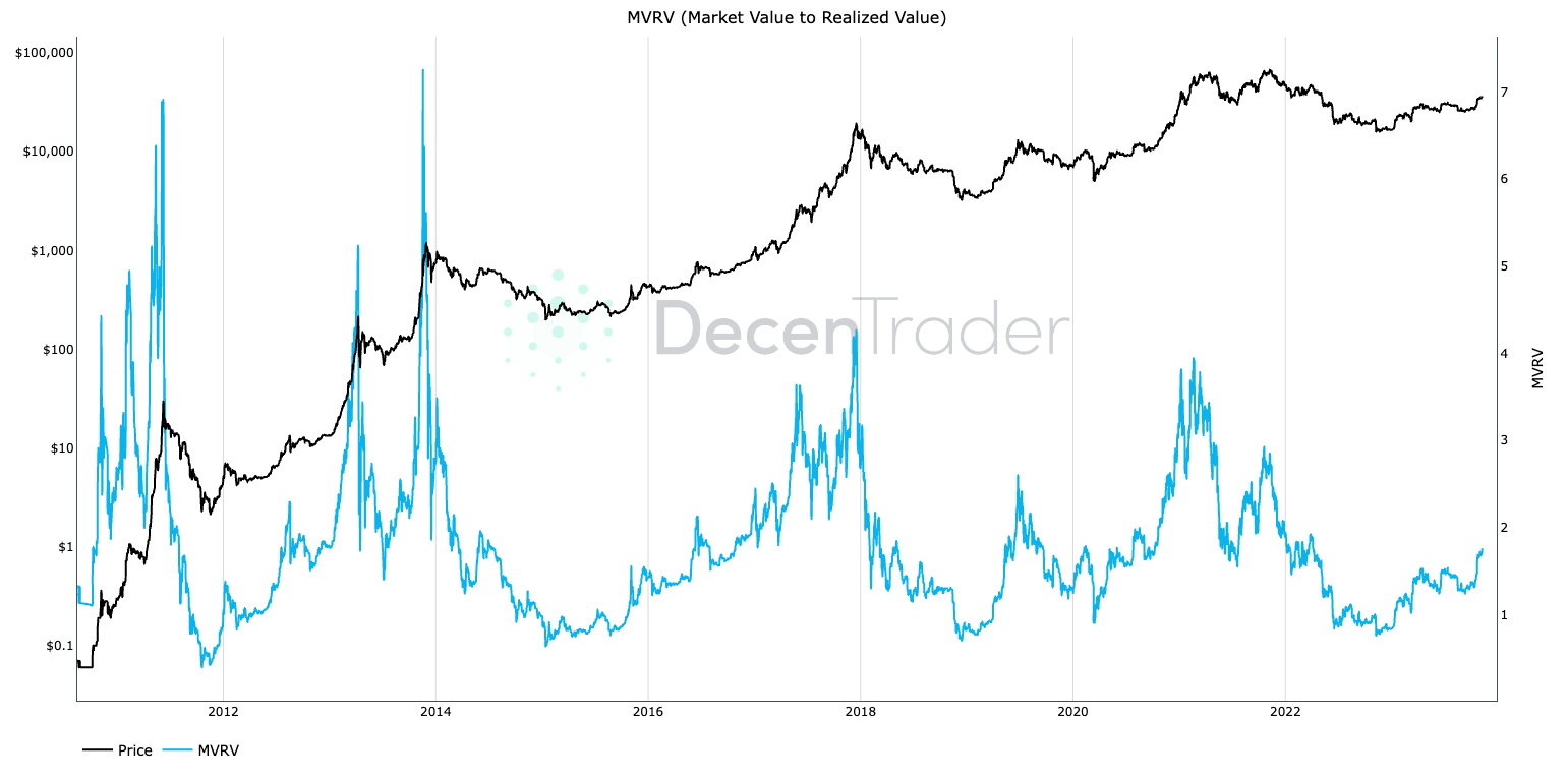O índice é medido pela capitalização do mercado atual dividido pelo preço médio pago pelos holders e atualmente está em 1,76, indicando um lucro médio não realizado de 76%.