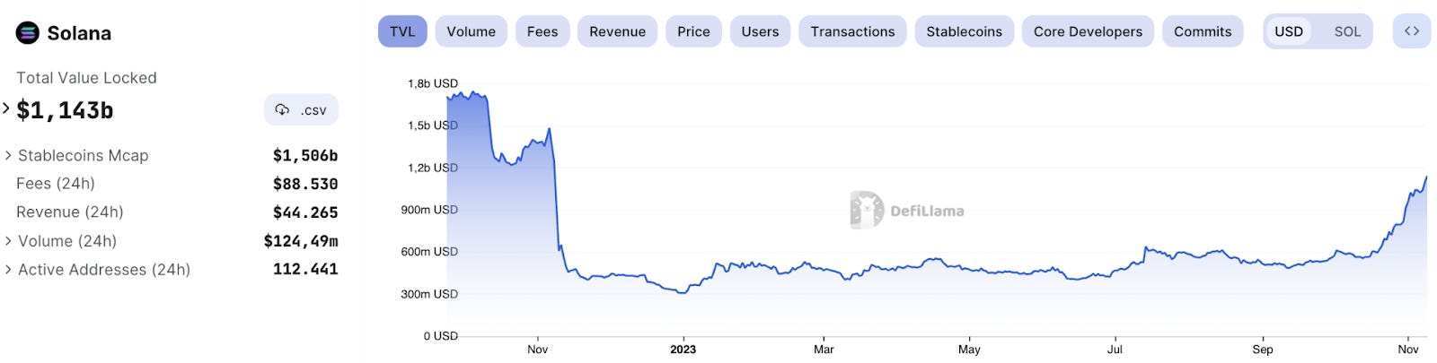 Em termos de valor travado (TVL) e volume negociado, a rede ainda não conseguiu voltar a seus níveis pré colapso da FTX, apesar da forte retomada das métricas nas últimas semanas.