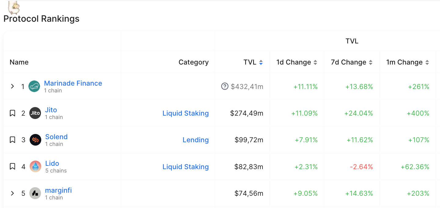 Além da própria valorização do token SOL, o setor de staking líquido foi o que puxou a recente retomada de crescimento. Os cinco maiores protocolos da rede são deste setor ou ao menos integram tokens de staking líquido em seu produto ao os aceitar como colateral para tomada de empréstimos, por exemplo.