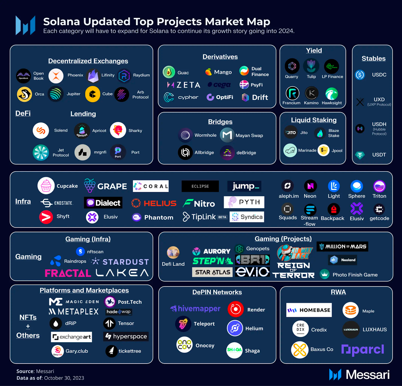 Outro setor interessante que vem em ascensão na Solana é o de infraestrutura física descentralizada (DePIN). Ele consiste em protocolos que incentivam usuários a oferecerem serviços de infraestrutura física, como, por exemplo, processamento de hardware, armazenamento de dados, transmissor de sinal Wi-Fi, carregamento de veículos elétricos, entre diversos outros. Os destaques do setor incluem a Helium e a Hivemapper. A Render é outro protocolo do setor que também cogita migrar para a Solana.