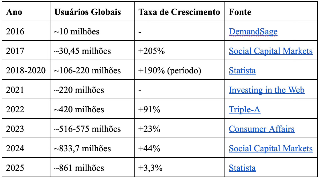 A evolução da base de usuários cripto é uma narrativa de crescimento exponencial pontuada por marcos históricos. Em 2016, quando o Bitcoin ainda era tratado como uma curiosidade tecnológica pela mídia mainstream, havia apenas 10 milhões de usuários de carteiras blockchain globalmente. O número parecia promissor para os evangelistas das criptomoedas, mas insignificante para o sistema financeiro tradicional.