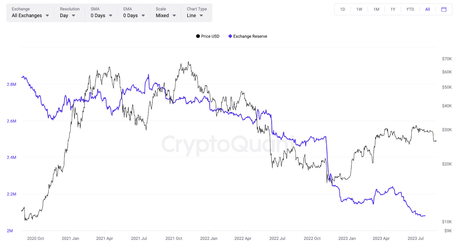 As reservas de Bitcoins de investidores mantidas por corretoras centralizadas atingiram seu menor valor desde janeiro de 2018. O gráfico a seguir mostra que atualmente cerca de 2,05 milhões de Bitcoins são custodiados por essas instituições. Somente neste mês de agosto, 480 mil bitcoins foram sacados.