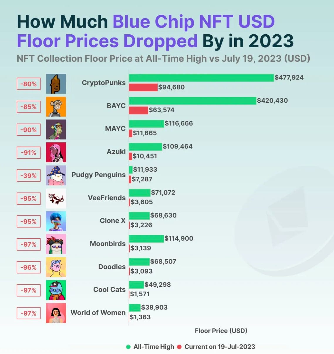 As principais coleções de NFT "blue chips" sofreram uma drástica queda de seu floor price desde as máximas históricas. Como elas são cotadas em ETH, além da queda do valor das coleções em si, deve-se mensurar a desvalorização do próprio token ETH. Em média, as coleções selecionadas se desvalorizaram 87,3% em dólares até o final de julho deste ano.