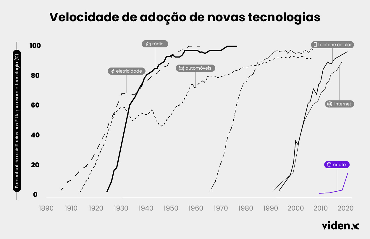 A partir daqui, discutirei como outras tecnologias inclusivas e que se espalharam pelo globo foram adotadas e as razões pelas quais nós, da viden.vc, acreditamos que os criptoativos estão perto do ponto de inflexão de adoção, semelhante ao processo que a internet passou no final do século passado.
