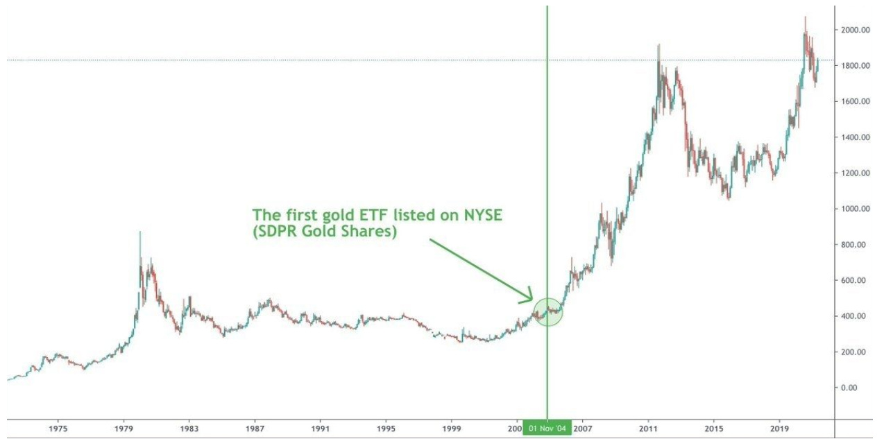 Um comparativo interessante para entender a dimensão do impacto de ETFs americanos em um determinado ativo é com o ouro. Em 2004, quando o primeiro ETF de ouro foi aprovado, os investidores passaram a ter um acesso muito mais fácil e prático ao ativo, fazendo com que houvesse um enorme influxo de capital e seu valor disparasse nos anos seguintes.