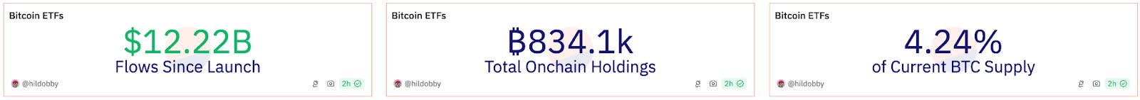 Desde então, o influxo de capital foi de mais de US$ 12,2 bilhões, elevando a quantia total custodiada por essas instituições para mais de 841,1 mil BTC. Esse montante corresponde a incríveis 4,24% de todos os Bitcoin que existem em circulação.