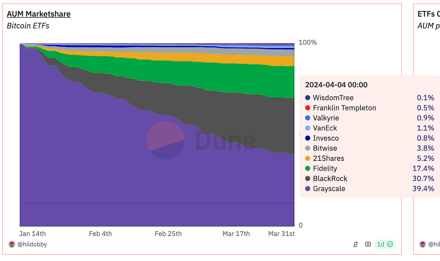 A distribuição atual ainda classifica a Grayscale como principal ETF, com 39,4% de marketshare, seguido pela Blackrock e a Fidelity, com 30,7% e 17,4% respectivamente.