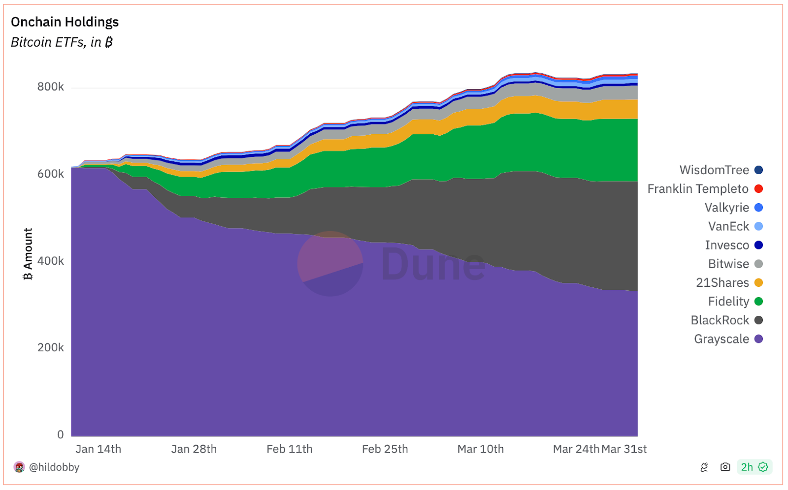 Grande parte desses 841,1 mil BTC em hold se deve ao ETF da Grayscale, que antes de 10 de janeiro era um trust e já possuía uma boa quantidade de BTC sob custódia (aproximadamente 617 mil BTC). Desde então, o fundo vem perdendo tamanho devido a possibilidade de conversibilidade dos recursos sem a taxa de desconto que estava sendo praticada no mercado secundário anteriormente.