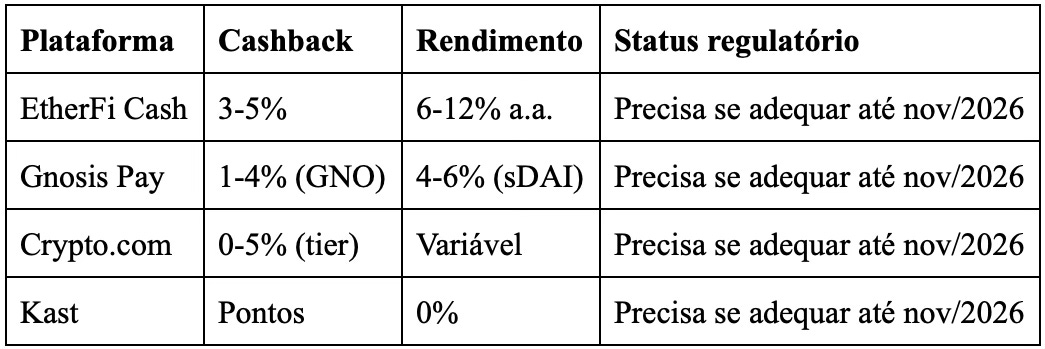 A dinâmica é clara: algumas empresas vão se adequar e aumentar taxas para cobrir compliance. Outras vão simplesmente bloquear os CPFs brasileiros. As que ficarem terão custos operacionais significativamente maiores, repassados aos usuários na forma de cashback menor, taxas maiores, ou rendimentos reduzidos.