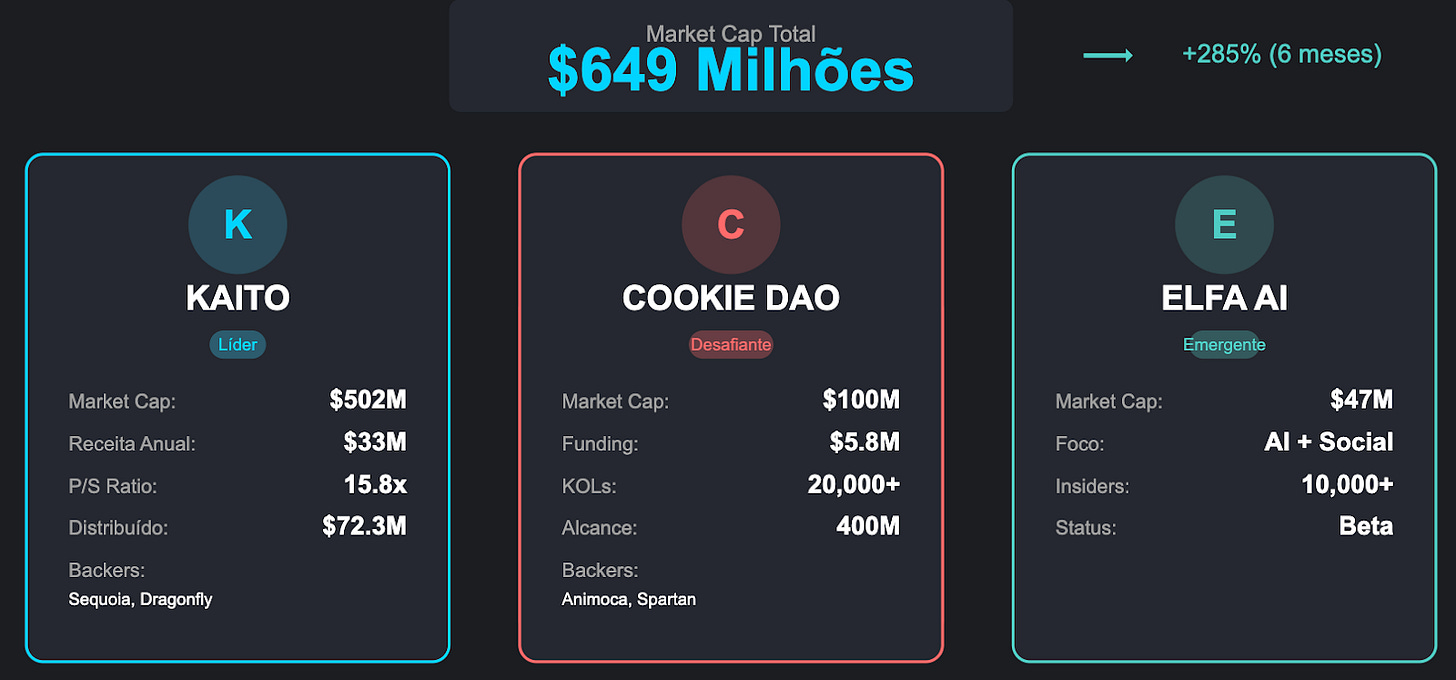 Para investidores, os números contam uma história intrigante. O setor InfoFi é avaliado em apenas US$ 649 milhões, o que representa menos de 0,03% da capitalização total do mercado cripto. Se InfoFi capturar apenas 1% do valor da economia da atenção digital (estimada em trilhões), estamos falando de um potencial de crescimento de 30 vezes ou mais.