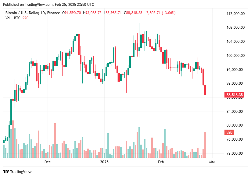 Metaplanet e El Salvador aproveitam a queda e compram mais BTC. A empresa japonesa e o governo de El Salvador aproveitaram a recente volatilidade do Bitcoin para aumentar os seus portfólios. A Metaplanet adquiriu 135 Bitcoins por US$ 13 milhões, a um preço médio de US$ 96.185 cada. Com isso, o seu portfólio totaliza 2.225 Bitcoins, avaliados em mais de US$ 205 milhões. Enquanto isso, El Salvador comprou 7 Bitcoin em 24 de fevereiro, superando sua média diária de uma unidade. O país agora detém 6.088 Bitcoins, equivalentes a US$ 560,7 milhões. (CriptoFacil)