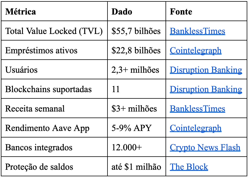 Apesar das turbulências, os números da Aave impressionam. O protocolo ultrapassou os US$ 55,7 bilhões em Total Value Locked (TVL) em novembro de 2025, com mais de US$ 22,8 bilhões em empréstimos ativos e 2,3 milhões de usuários espalhados por 11 blockchains. A receita semanal supera os US$ 3 milhões, consolidando a Aave como líder absoluta no mercado DeFi de empréstimos.
