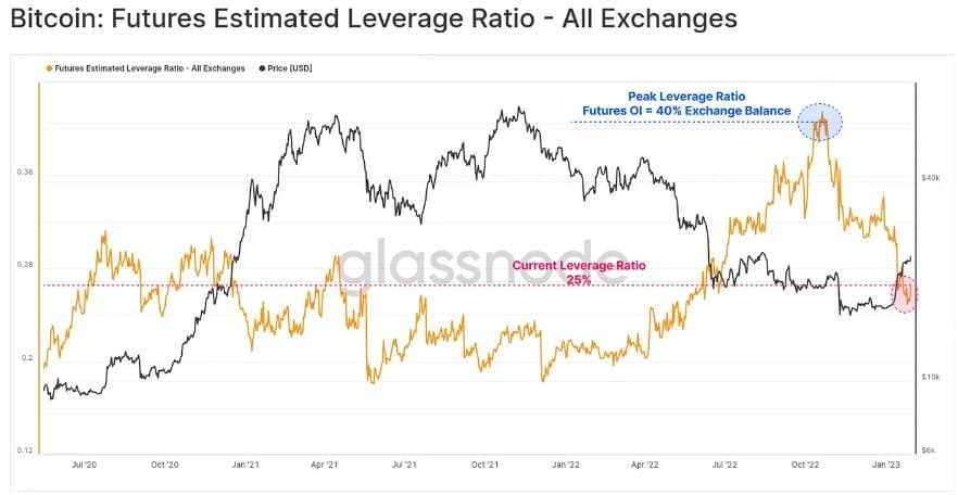 No entanto, apesar dessa melhora do mercado, o total de alavancagem em aberto está em declínio desde o colapso da FTX, no início de novembro.