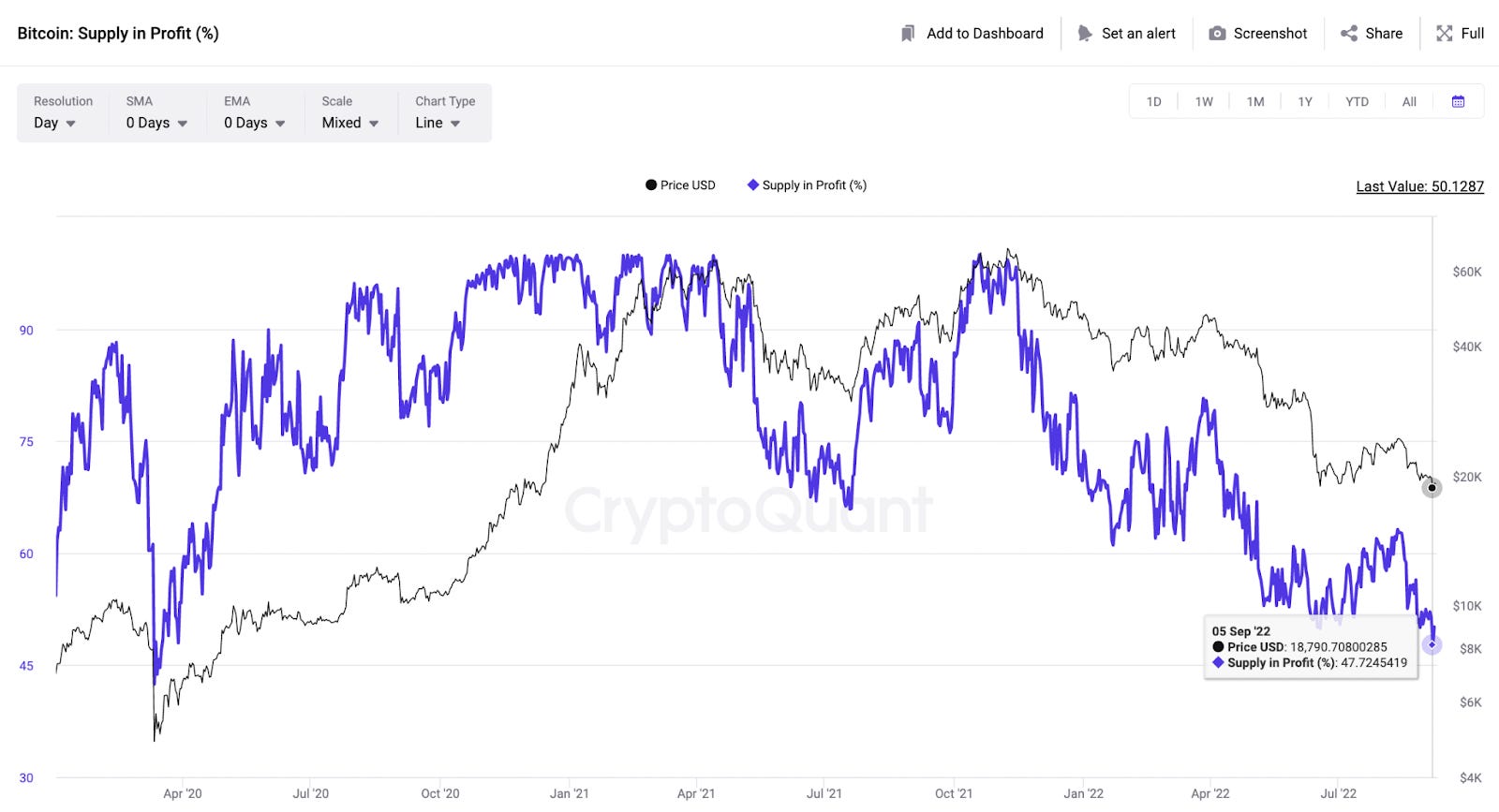 Pela primeira vez desde março de 2020, mais de 50% da oferta total de bitcoins está no prejuízo em relação ao valor adquirido. Esse marco é significativo, pois todos os fundos dos bear markets anteriores também passaram por essa mesma região antes de começar uma tendência de alta. Isso indica um momento interessante de capitulação profunda e um bom indicador para aportes fracionados visando o longo prazo, apesar de não estar claro quanto tempo essa fase ainda vai durar antes que ocorra uma reação.