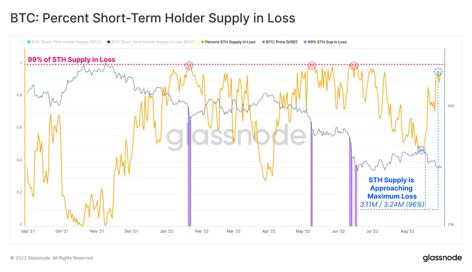A quantidade de investidores em prejuízo fica ainda mais evidente quando analisamos o gráfico dos Short Term Holders. Como pode-se ver no gráfico abaixo, desde o pico de preço histórico do bitcoin em US$ 69 mil, ocorreram alguns momentos em que a porcentagem em prejuízo dos investidores de curto prazo chegou a ser de 99%. Atualmente, essa porcentagem se aproxima novamente desse valor, atualmente estamos em 96% desses investidores em prejuízo. É interessante perceber que nesses pontos que batem 99% há a formação de fundos locais de preços.