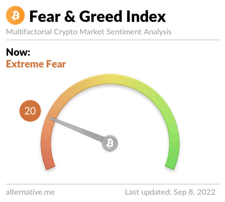 O indicador Fear & Greed index, que mensura o sentimento de mercado em relação ao momento atual, se mantém em um patamar de “medo extremo” em 20 pontos. Ele vem em uma decrescente após ter atingido 42 pontos em um patamar de "medo" um mês atrás. Antes disso, ele vinha se recuperando desde sua mínima do ano em junho, quando atingiu os 6 pontos.