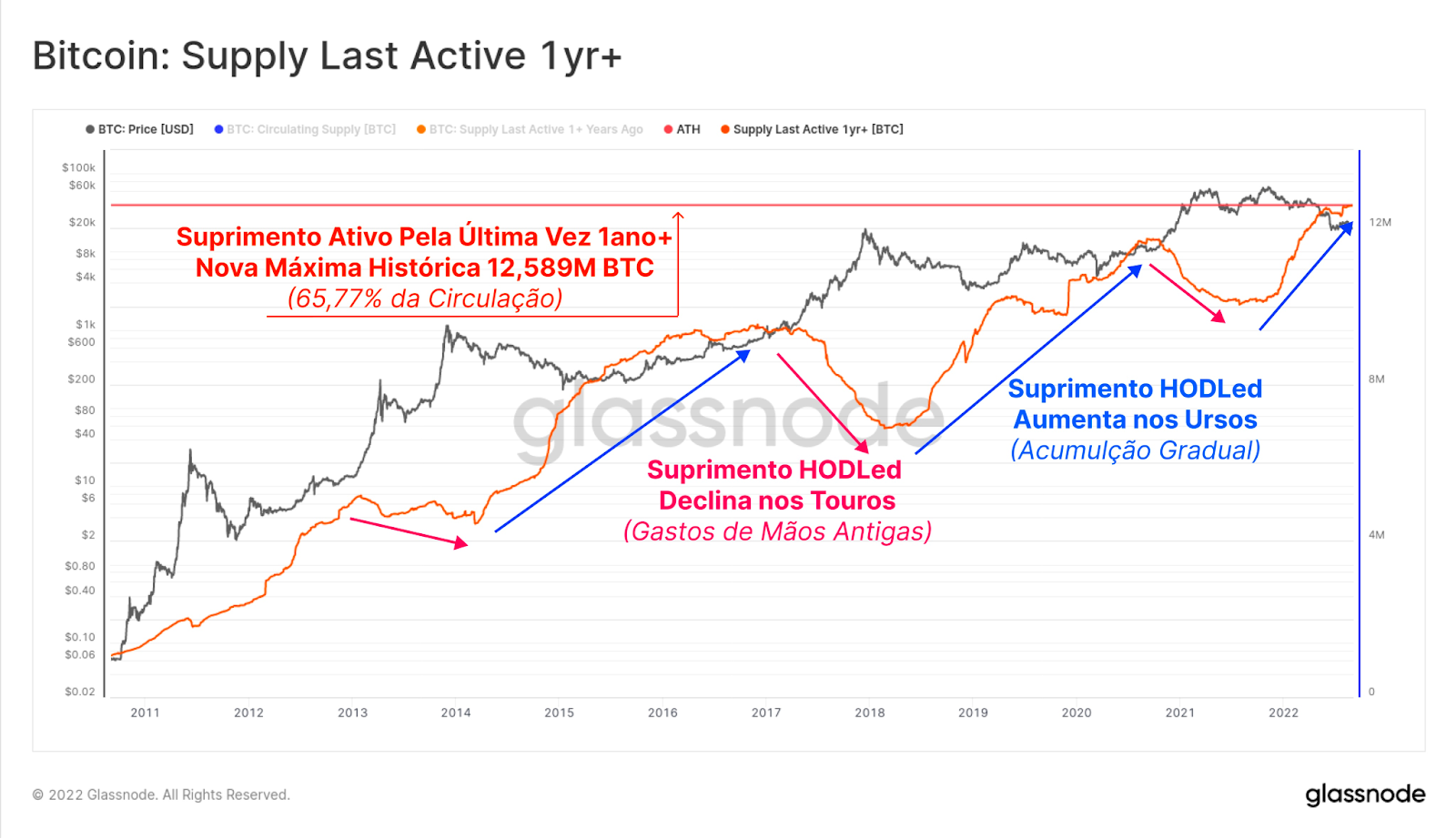 Enquanto isso, a quantia de bitcoins que não é gasta a ao menos um ano atingiu um novo pico máximo, representando 65,77% da oferta total de moedas. Esse movimento é característico de momentos de bear market e a cada ciclo ele fica mais intenso, como podemos ver no gráfico abaixo.