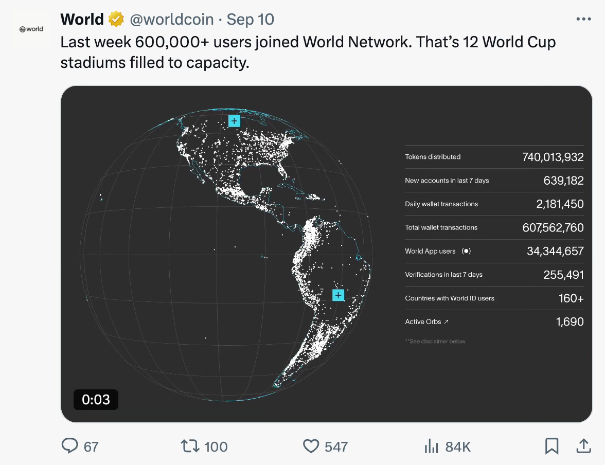 O Worldcoin verificou 16,9 milhões de pessoas em 160 países e o World App tem 34 milhões de usuários. São números impressionantes, mas representam apenas 0,2% da população global. Com 530 mil novas verificações em uma semana em setembro, levaria mais de 250 anos para verificar todos os 8 bilhões de humanos no ritmo atual.